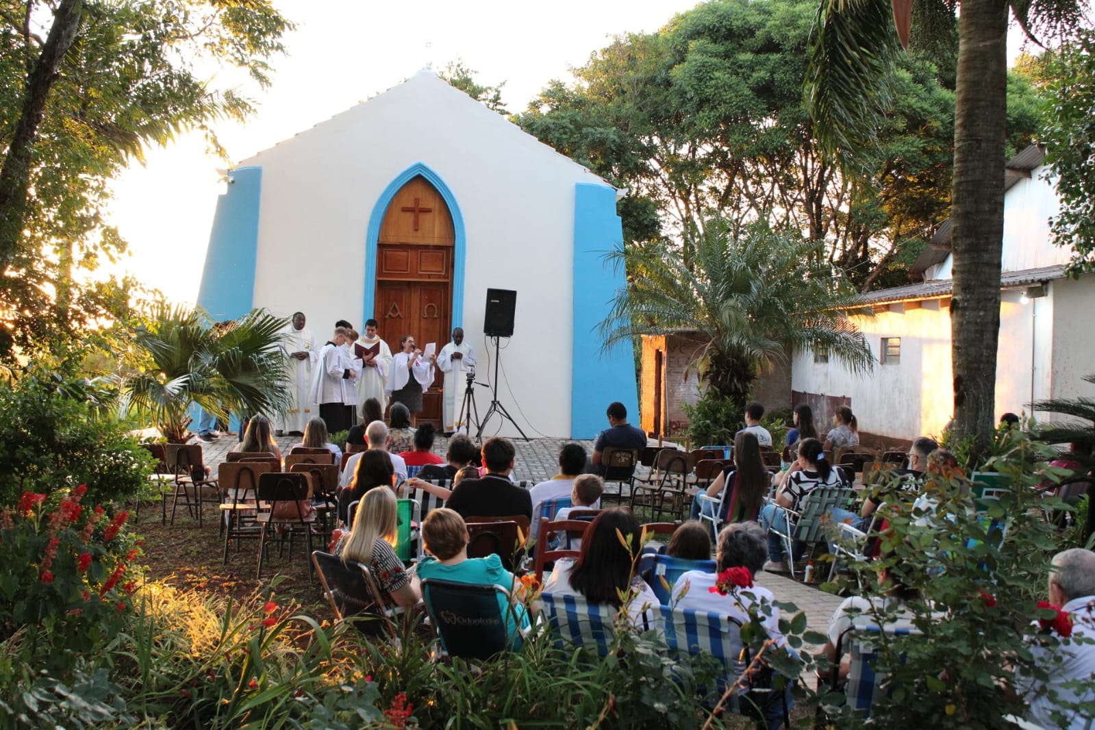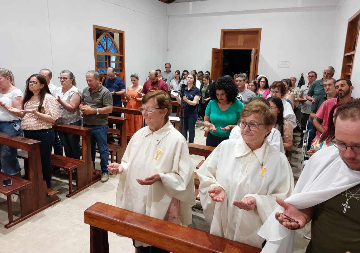 A Santa Missa, reuniu dezenas de pessoas, ocupando a capela e a espaço externo. A comentarista saudou os presentes: Depois de muito sonhar, trabalhar e rezar, chegamos ao dia da reinauguração da capela, depois de restaurada. Construir uma igreja ou restaurá-la, á mais do que erguer ou embelezar um edifício. É celebrar os mistérios da fé por meio das obras humanas. É certo dizer que Deus não precisa de casa, de edifícios ou de Templo (Is 66, 1-2). Mas também é certo dizer que Ele inspira a seus filhos modos humanos de estarem em plena comunhão com Ele e em plena comunhão entre si. “Eu vou gostar Templo que vocês me farão e nele manifestarei a minha glória – diz o Senhor” pela voz do profeta Ageu (Ag 1,8b). É dia de gratidão a Deus, à equipe e aos romeiros da Caminhada Bíblica, aos profissionais que trabalharam, à nossa comunidade e a todos que por meio de doações e ofertas possibilitaram a conclusão dessa obra. Finalizando convidou a todos a acompanharem a benção e incensação interna e eterna da capela.