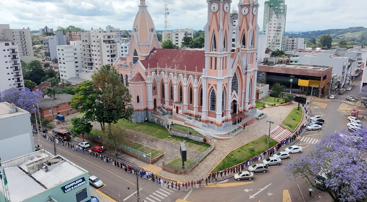 Por volta das duas horas da tarde, os jovens iniciaram a caminhada jubilar. Saíram em peregrinação de uma praça próxima ao mercado da Cotrifred e seguiram, em canto e oração, até a Catedral Santo Antônio. A caminhada foi expressão viva do tema do encontro: “Jovens, peregrinos da esperança”. Cada passo dado lembrava a missão de caminhar com fé, levando Cristo aos caminhos do mundo. Ao chegar à Catedral, os jovens abraçaram o templo, gesto simbólico de amor à Igreja e de compromisso com a fé. Em seguida, todos tiraram uma grande foto em frente à Catedral, registrando para sempre aquele momento inesquecível.